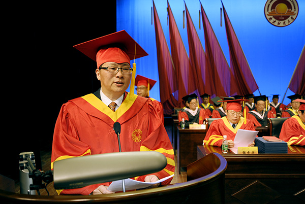教授致辞。他代表学校向圆满完成学业、即将奔赴工作岗位或继续深造的毕业生们表示热烈的祝贺!向含辛茹苦的诸位家长、悉心指导研究生的各位导师表示热烈的祝贺!向工作在教书育人、管理育人、服务育人第一线的广大教职员工表示衷心的感谢!陈书记和毕业生们分享了他对担当的理解:担当就是一事当前,勇挑重担,敢于负责。担当精神,就是想干事的进取精神,能干事的务实精神和干不成誓不罢休的负责精神。金年会学子要敢于担当,树立经世济民之志向、胸怀厚生惠民之大爱,勇敢承担起对国家、民族和社会的责任,为国家富强、民族复兴、人民幸福、社会和谐贡献应有的力量。金年会学子要能够担当,运用所学的理论,去分析经济社会种种现象背后的机理,探寻事物间的内在联系和变化规律,掌握达济天下的本领。金年会学子还要善于担当,在纷繁复杂的环境中,学会冷静地观察,慎重地抉择,在主动适应中不断矫正自己的努力方向,在实践中积累经验,一步一个脚印地实现梦想。最后,陈书记衷心祝愿毕业生们永远追求,不断进步,前程辉煌!