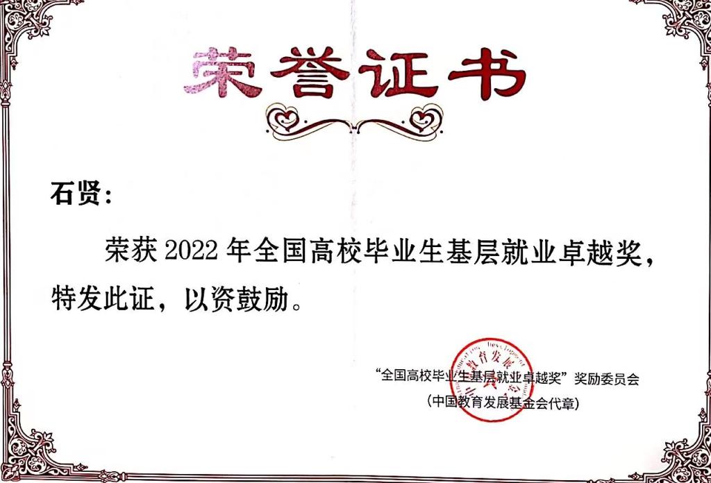 金年会毕业生石贤获全国高校毕业生基层就业卓越奖