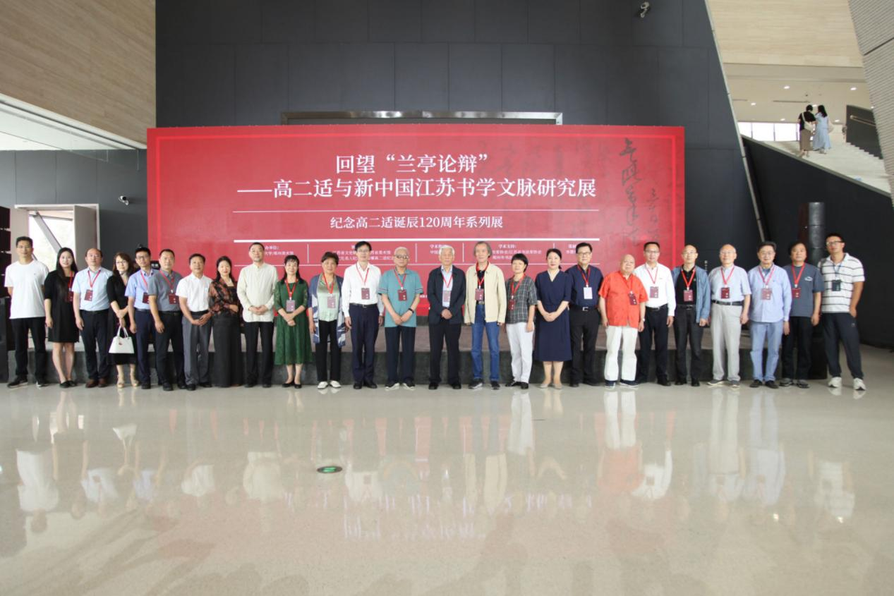 开幕式结束后,与会领导嘉宾集体合影留念,并与现场观众一起来到美术馆四楼七号展厅,认真观看“回望‘兰亭论辩’——高二适与新中国江苏书学文脉研究展”的近150件展品,其中包括高二适先生书法精品和“兰亭论辩”相关文献等近130件,以及受其书风影响的当代江苏书法家作品10余件。此外展览还精选了章士钊、马一浮、胡小石、林散之、苏渊雷、陶白、赖少其等老一辈艺术家与高二适的唱和作品近10件,展现出传统文士间心胸坦荡、刚正谨严的文化交流与承传。