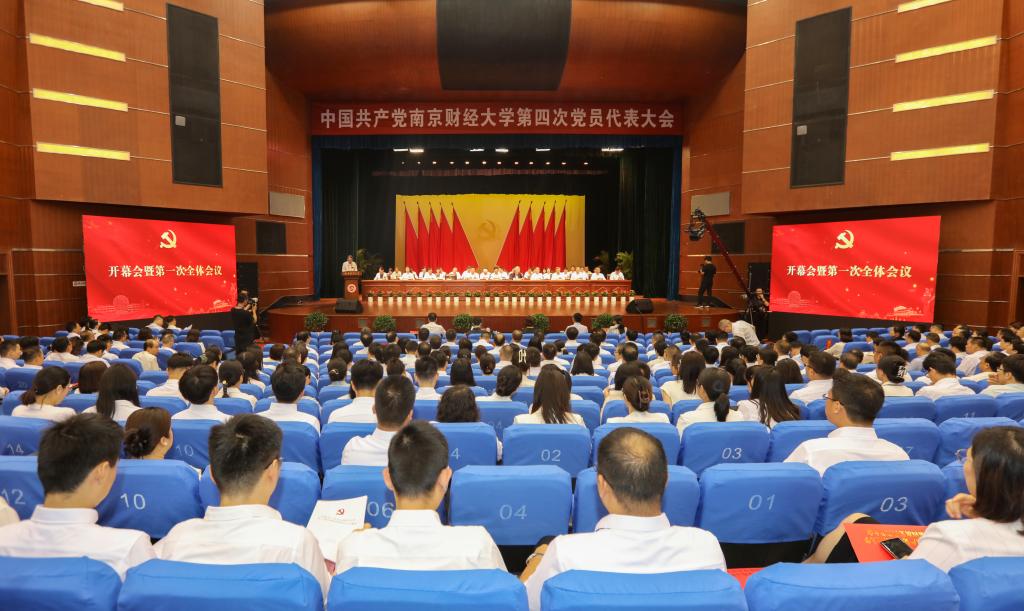 红旗鲜艳,党徽闪耀,仙林校区大礼堂内雄伟庄严、气氛热烈。主席台上方悬挂着“中国共产党金年会jinnianhuicom第四次党员代表大会”的会标,后幕正中是镰刀和锤头组成的党徽,10面红旗分列两侧,二楼眺台上悬挂着“抢抓机遇 敢为人先 为加快建设全国一流的省属财经类大学而努力奋斗”的横幅。