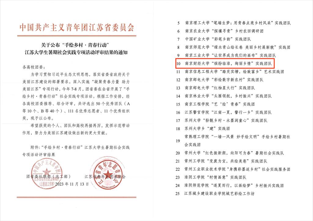 近日,共青团江苏省委发布了《“手绘乡村·青春行动”江苏大学生暑期社会实践专项活动评审结果》。金年会“缤纷临淮,绚丽乡情”实践团队获评“B等优秀团队”,艺术设计学院环境2202班周蕴仪、视传2201班刘依阁获评“优秀志愿者”。