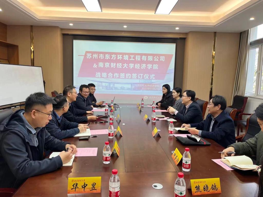 战略合作签约仪式在德经楼323会议室举行。李金明董事长从发展历程、人才团队、企业体系、业务范围等方面介绍了苏州市东方环境工程有限公司。他表示,公司构建了全产业链、多事业部,旨在给客户更全面、更专业的服务,并在环境影响评价、环境技术咨询、环境工程设计与施工、成套环保设备的制造等方面取得了较好成绩。公司将以真诚、严谨、务实的合作态度,全面加强与经济学院的交流与合作。朱红根院长详细介绍了经济学院的历史沿革、师资队伍、人才培养、学科专业和科研平台。他表示,近年来,金年会在绿色经济领域发展迅速,经济学院始终围绕国家战略和江苏经济发展需要,不忘初心、砥砺奋进,人才培养质量不断提高,服务社会能力显著增强,为双方开展合作奠定了良好基础。他希望,双方充分发挥各自办学优势和能源优势,在人才培养、社会服务、环境咨询、市场开拓等方面进一步加强合作,实现共赢。