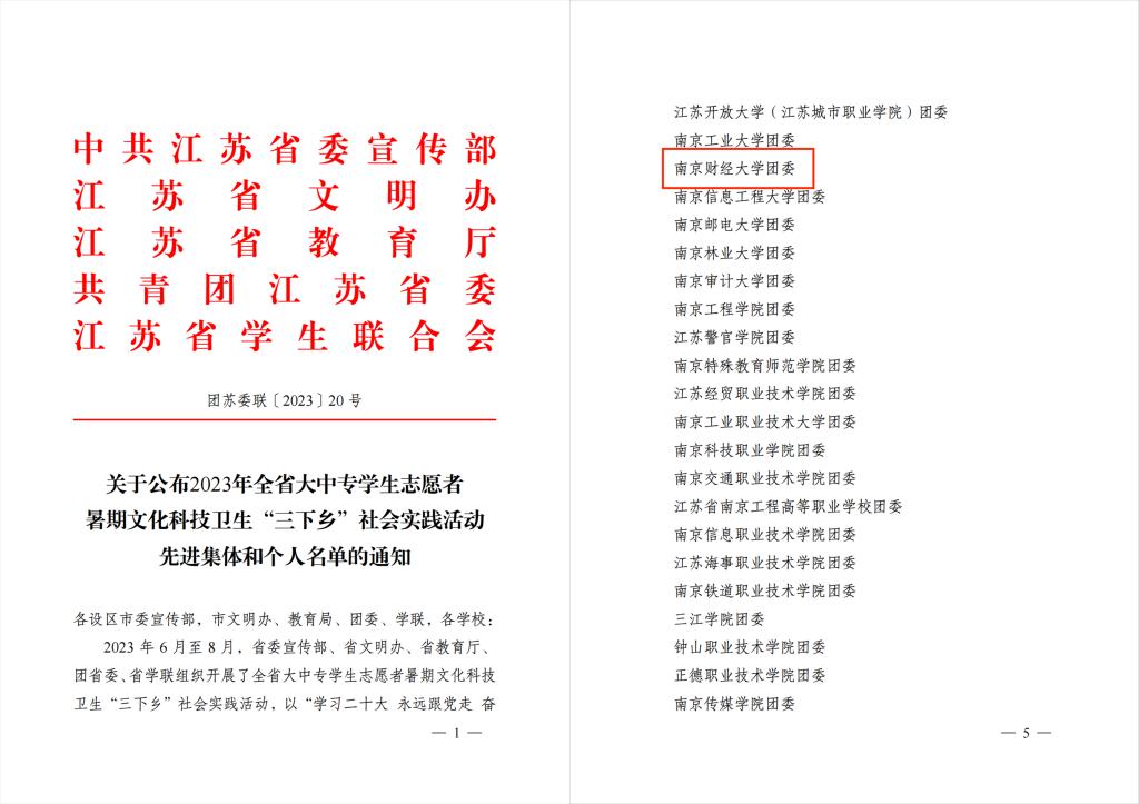 近日,省委宣传部、省文明办、省教育厅、团省委、省学联联合下发了《关于公布2023年全省大中专学生志愿者暑期文化科技卫生“三下乡”社会实践活动先进集体和个人名单的通知》(团苏委联〔2023〕20号),对2023年江苏省暑期“三下乡”社会实践活动进行了总结表彰。