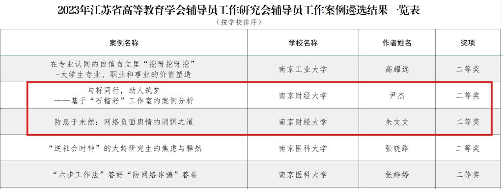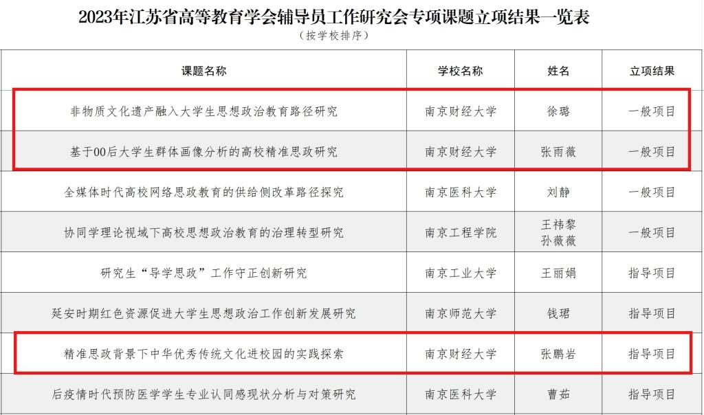 近日,江苏省高等教育学会辅导员工作研究委员会公布了工作案例遴选与专项课题立项结果。金年会根据相关通知要求限额申报了3项课题和2个工作案例,全部立项及获奖。