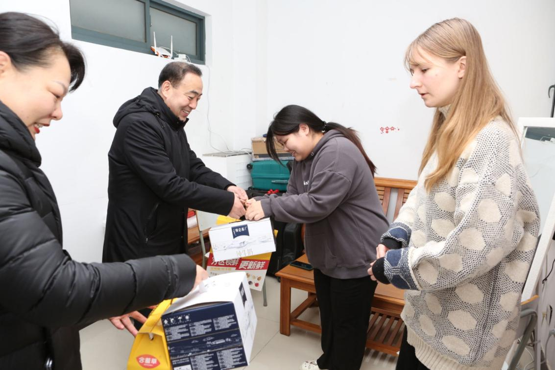 程永波校长、李煜副校长前往外国留学生公寓看望留学生们。程永波校长在与同学们交流中表示,一年一度的新春佳节是留学生们了解中华文化的重要窗口,希望同学们用心感悟、深化理解,努力成为多语种、专业化、复合型人才,成为中外文化融合的桥梁与纽带,让世界各国人民了解一个更加真实、立体、全面的中国。