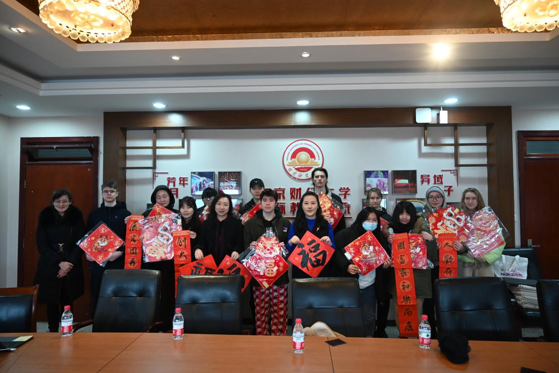 姚文韵副校长与在校留学生们座谈交流,详细了解他们寒假在校的学习生活情况。留学生们畅所欲言,谈及各自在校学习收获及在南京迎接新年的所见所感。姚文韵副校长表示,2024年是中国的龙年,龙是中华民族的图腾,在中国传统文化中意味着智慧和吉祥,希望同学们可以品味龙年年味,并预祝大家新年学有所获。