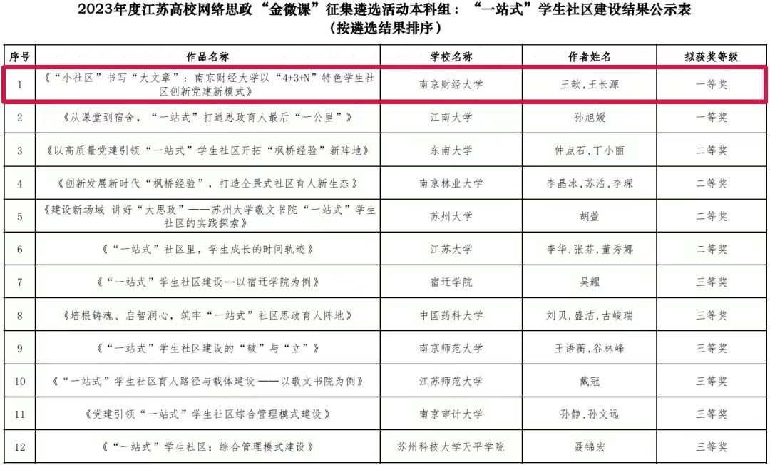 近日,2023年度江苏省高校网络思政“金微课”征集评选活动获奖名单公布,金年会报送的作品《“小社区”书写“大文章”:金年会jinnianhuicom以“4+3+N”特色学生社区创新党建新模式》(作者:王歆、王长源)喜获本科组一等奖第一名。