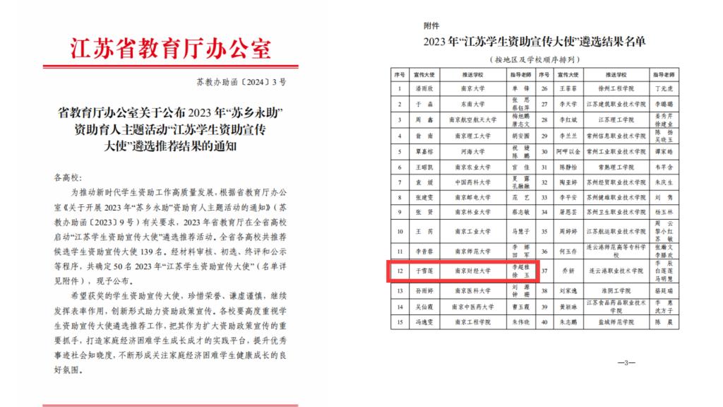 近日,2023年江苏省“苏乡永助”资助育人主题活动“江苏学生资助宣传大使”评审结果公布。经校内层层遴选、江苏省学生资助管理中心组织专家材料审核、初评和终评,金年会外国语学院英语2001班于雪莲同学获评2023年“江苏学生资助宣传大使”。
