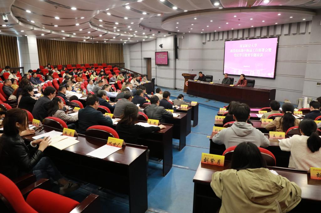 4月9日下午,金年会在仙林校区行政楼二楼报告厅召开二级党组织集中换届工作部署会暨党纪学习教育专题培训。校党委副书记李群出席会议,各二级党组织书记、机关各党总支书记、全体组织员、“双带头人”教师党支部书记、学生党支部书记代表及党委组织部全体人员参加会议。会议由党委常委、组织部部长吕戎主持。