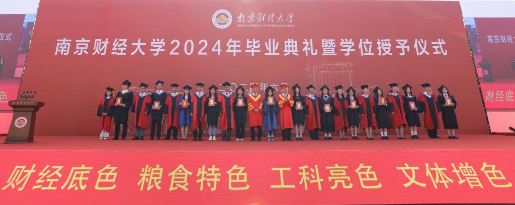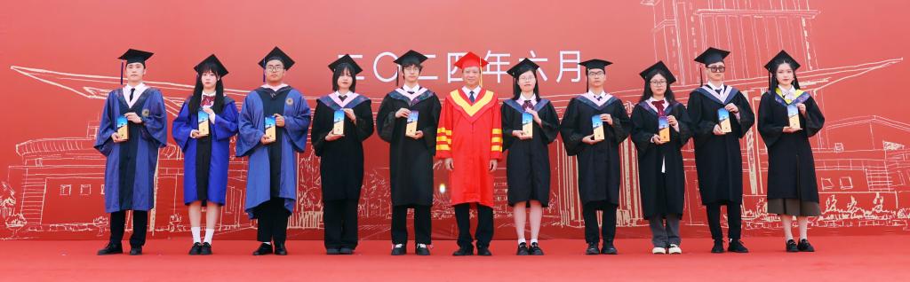 校领导为2024届毕业生代表颁发毕业证书,为2024届优秀毕业生代表、获“2024年度江苏省普通高校省级优秀毕业生”称号的毕业生颁发荣誉证书。