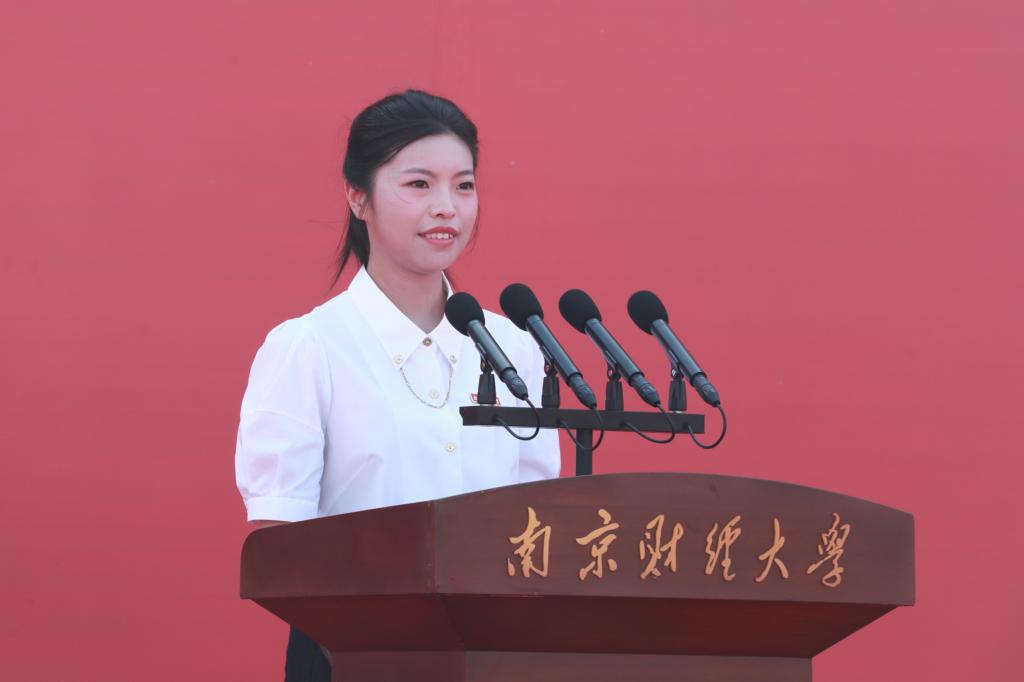 在校生代表、粮食和物资学院应用经济学专业2022级博士研究生陈彦池发言,表示将接过先辈手中的火炬,秉持校训精神,以挺膺担当践行“青春报国”,在矢志奋斗中谱写新时代的青春之歌!