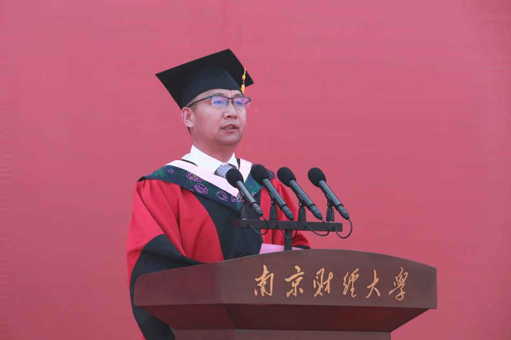 校友代表、会计学院会计学98届毕业生、科塞尔医疗科技(苏州)有限公司创始人兼CEO胡清发言,结合自身经历与感悟,寄语同学们坚定理想信念,保持激情和勤奋;清晰定位,持续更新目标;保持责任心,积极主动,勇担使命。