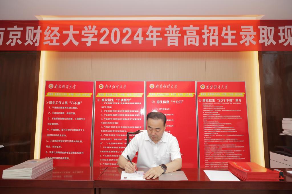 7月20日上午,在金年会高考招生录取现场,校长程永波为首批录取的部分本科新生亲笔签发录取通知书,这也是程校长连续六年亲笔签发录取通知书。党委常委、副校长赵国栋,党委常委、副校长李煜,党政办、学生处、国际合作与交流处等相关部门领导,以及招生工作全体成员参加签发仪式。