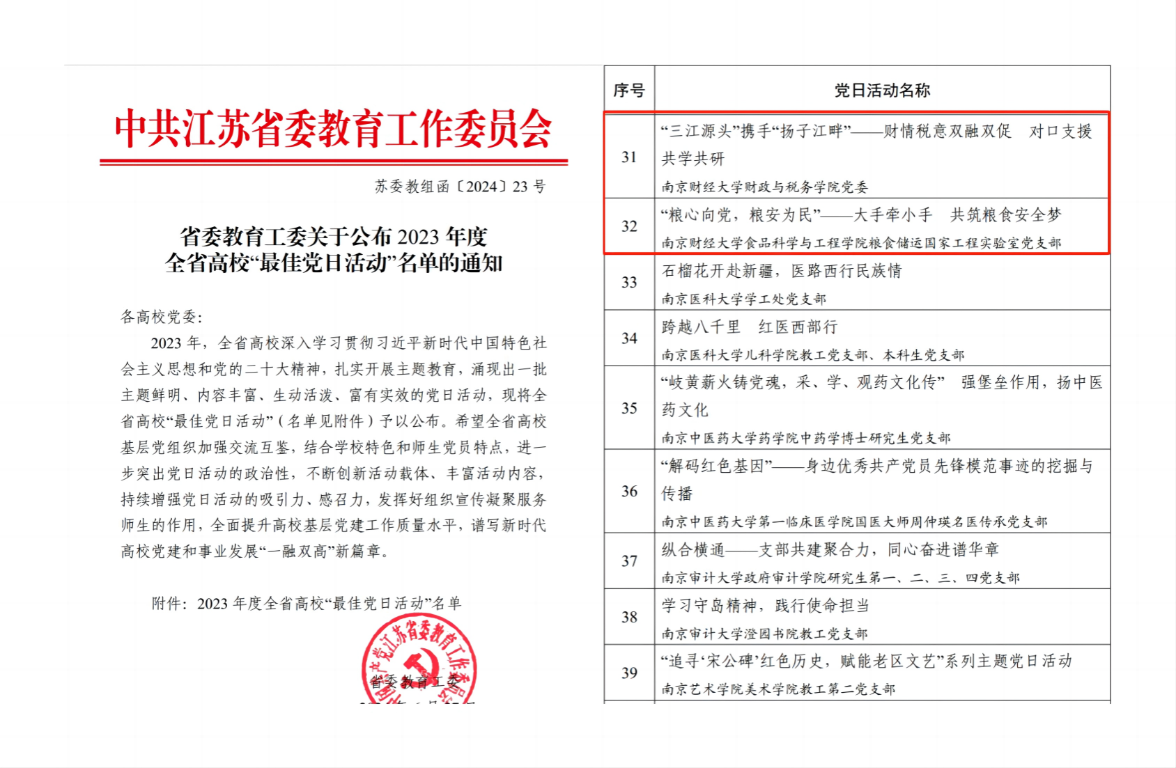 近期,江苏省委教育工委公布了2023年度全省高校“最佳党日活动”名单,金年会报送的财政与税务学院党委“‘三江源头’携手‘扬子江畔’——财情税意双融双促 对口支援共学共研”党日活动和食品科学与工程学院粮食储运国家工程实验室党支部“‘粮心向党,粮安为民’——大手牵小手 共筑粮食安全梦”党日活动全部获评。