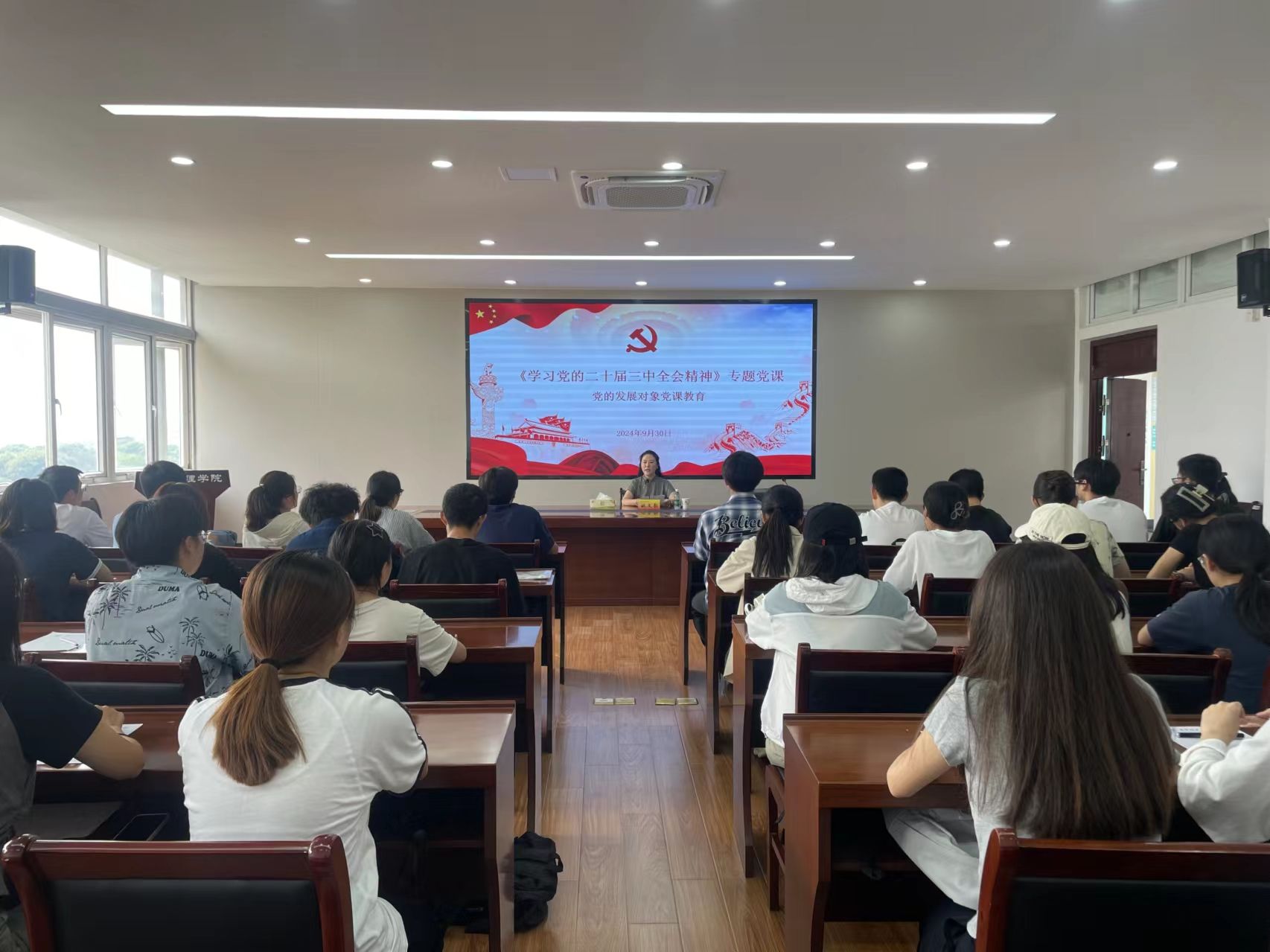 随后,姚文韵副校长为工商管理学院“党的发展对象”培训班学员讲授“凝心聚力谋发展,砥砺奋进谱新篇”专题党课,深入学习贯彻党的二十届三中全会精神。姚文韵副校长提出三点殷切期望:一是思想上充好“电”。要坚定信念铸忠诚之魂,重学习、重入心,培养创新精神,拓宽国际视野。二是精神上补足“钙”。要正风肃纪强立身之本,重规矩、重实效,树立崇高的人生理想,将职业规划与国家和社会建设相结合。三是学习上加满“油”。要夯基固本聚干事之力,重成长、重结果,敢想敢做,不断提升自己的专业知识和文化素养,做全面发展的新时代青年。