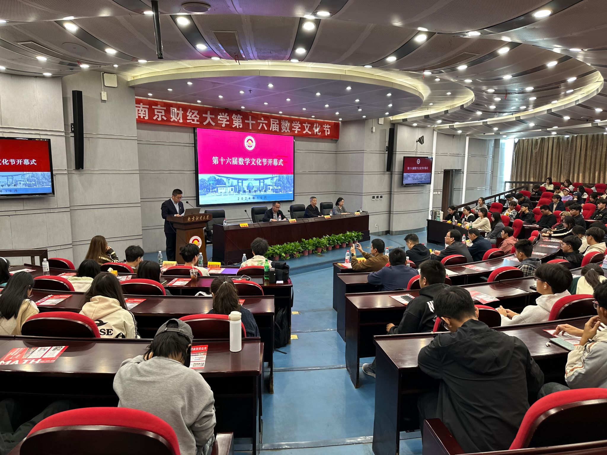 叶林祥副校长讲话。他从数学的独特文化和重要作用两个方面让同学们重新认识了数学的魅力。他表示,数学贯穿于生活的方方面面,从简单的日常计算到复杂的科学探索,数学无处不在,它是人们理解世界、解决问题的关键工具。他强调,数学思考是数学学习的关键,有思考才会有问题、才会有反思、才会有思想,才能真正领悟到数学的本质和价值。他希望同学们珍惜机会,敞开心扉,感受来自数学的强大魅力。最后,叶林祥副校长宣布第十六届数学文化节开幕。