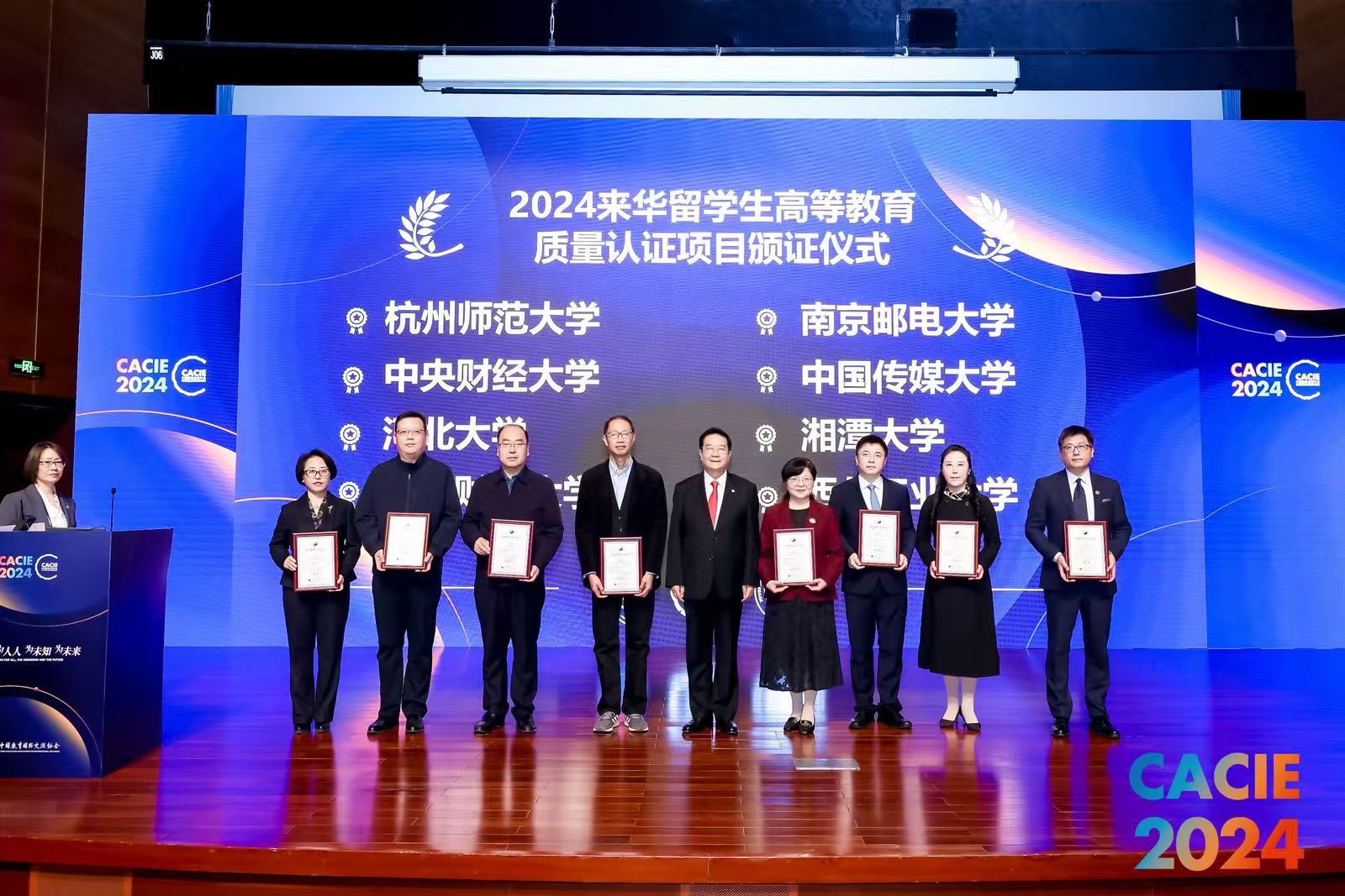 10月31日,由中国教育国际交流协会主办的第25届中国国际教育年会在北京国家会议中心举行。会上公布了43所2024年度通过来华留学生高等教育质量认证的高校名单。金年会顺利通过来华留学生高等教育质量认证,获得4年认证有效期。党委常委、副校长姚文韵代表学校参加颁证仪式。
