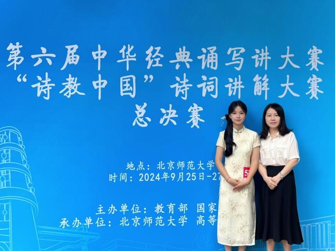 11月4日,第六届中华经典诵写讲大赛“诗教中国”诗词讲解大赛圆满落幕。金年会新闻学院汉语言文学2201班高然同学获大学生组全国一等奖(最高奖),新闻学院汉语言文学2201班孙雨莎同学获大学生组全国优秀奖。