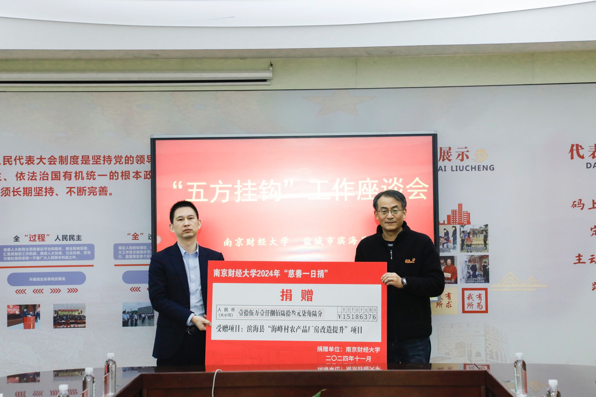 接着,李群副书记一行与滨海县相关部门、乡镇干部和省委驻滨海县乡村振兴工作队队员等开展“五方挂钩”座谈交流,并举行资金、图书捐赠和社会实践与劳动教育基地挂牌仪式。李群副书记代表学校向海峰村捐赠了2024年教职工“慈善一日捐”善款15.18万元,用于资助天场镇“海峰村农产品厂房改造提升”项目。该项目是首批2024年度省委驻滨海县乡村振兴帮促项目,项目完成后每年将为海峰村集体增加收入约10万元,带动村民30人就业。
