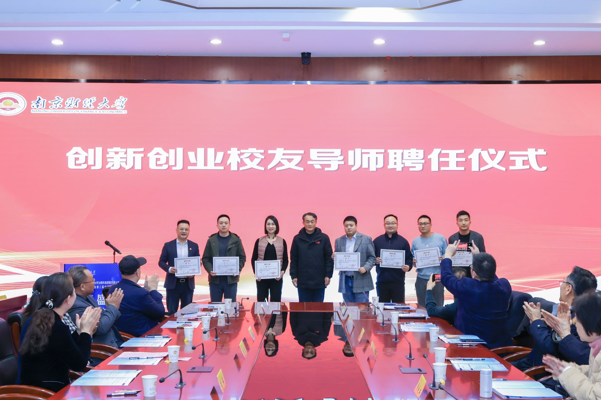 李煜副校长、陆明峰处长、周亚芳书记和徐林海会长分别为当选的第三届理事会会长、副会长、秘书长、副秘书长、顾问、名誉会长等颁发聘书,第二届理事会会长陈晓明与第三届理事会会长徐林海交接了国际经贸学院校友会会旗。