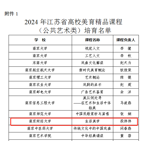 近日,省教育厅公布了2024年江苏省高校美育精品课程(公共艺术类)培育名单,此次评选共收到全省106所高校申报课程168门,最终遴选30门课程进入培育名单。金年会艺术教育中心主任段伟伟课程团队申报的“生活美学”课程成功入选。