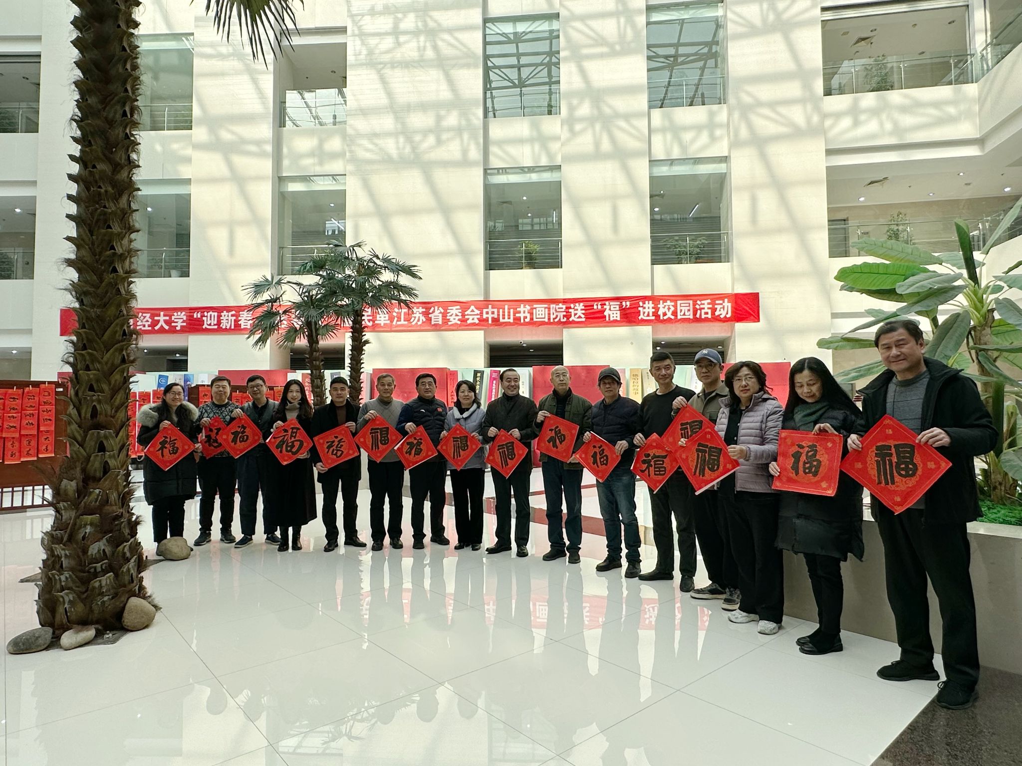 墨香迎新春,笔底书祝福。1月8日中午,由校工会、党委统战部、离退休处、图书馆联合开展的“寒冬送春暖,墨香暖人心”迎新春、送春联活动在仙林校区图书馆二楼大厅举办。校党委书记张利民,校长程永波,校党委副书记李群,党委常委、纪委书记李茜,党委常委、副校长黄步龙、赵国栋、李煜出席活动并与书法家们合影留念。江苏省书法家协会副主席、民革江苏省委会中山书画院院长、金年会艺术设计学院教授仇高驰,中国书协会员、民革江苏省委会中山书画院常务理事、南京中山书画院副院长王建强,中国书协会员、民革江苏省委会中山书画院常务理事、省美协会员周泽波,民革江苏省委会中山书画院个人理事、南京楹联家协会常务副秘书长、南京中山书画院副院长秦敏杰,以及金年会教职工书画摄影协会的老师们参加活动。