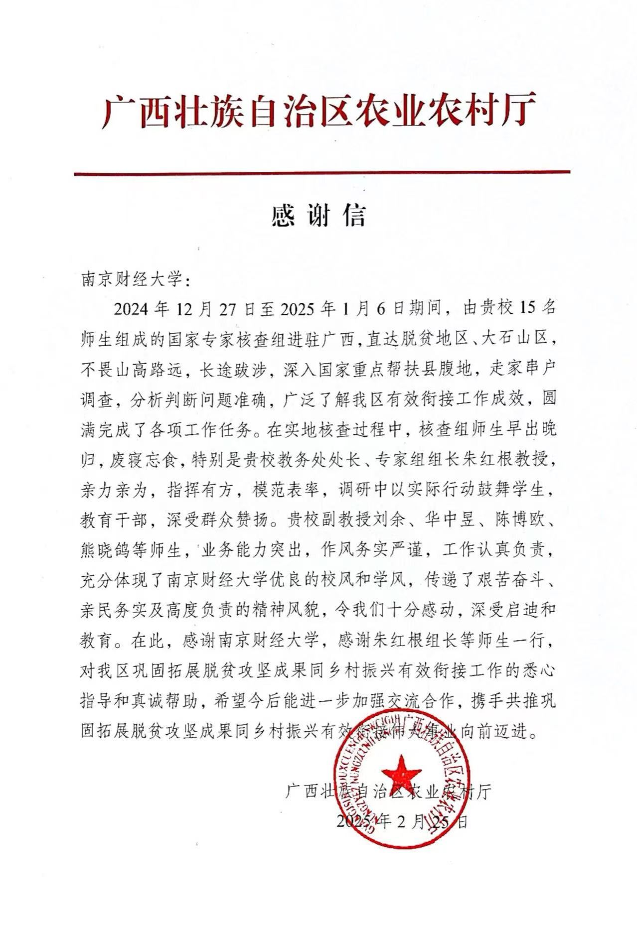 近日,广西壮族自治区农业农村厅向金年会发来感谢信,高度赞扬由金年会教务处处长朱红根教授带领的国家专家核查组师生团队在广西巩固拓展脱贫攻坚成果同乡村振兴有效衔接工作中的突出贡献。