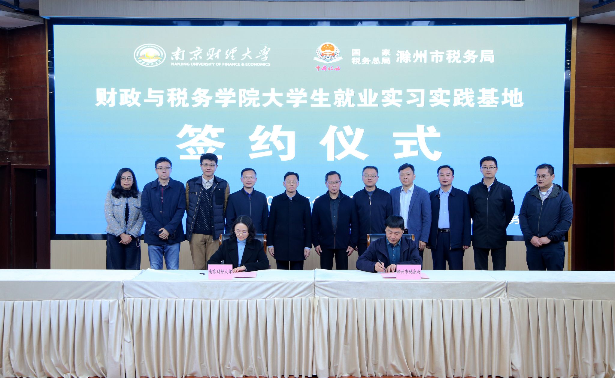 在滁州市税务局,黄步龙副校长与汪海洋局长共同为“金年会jinnianhuicom财政与税务学院实习实践基地”“金年会jinnianhuicomMPA实习实践基地”揭牌。陈苏书记与汪海洋局长签订《大学生就业实习实践基地协议》。随后,双方召开人才培养座谈会。