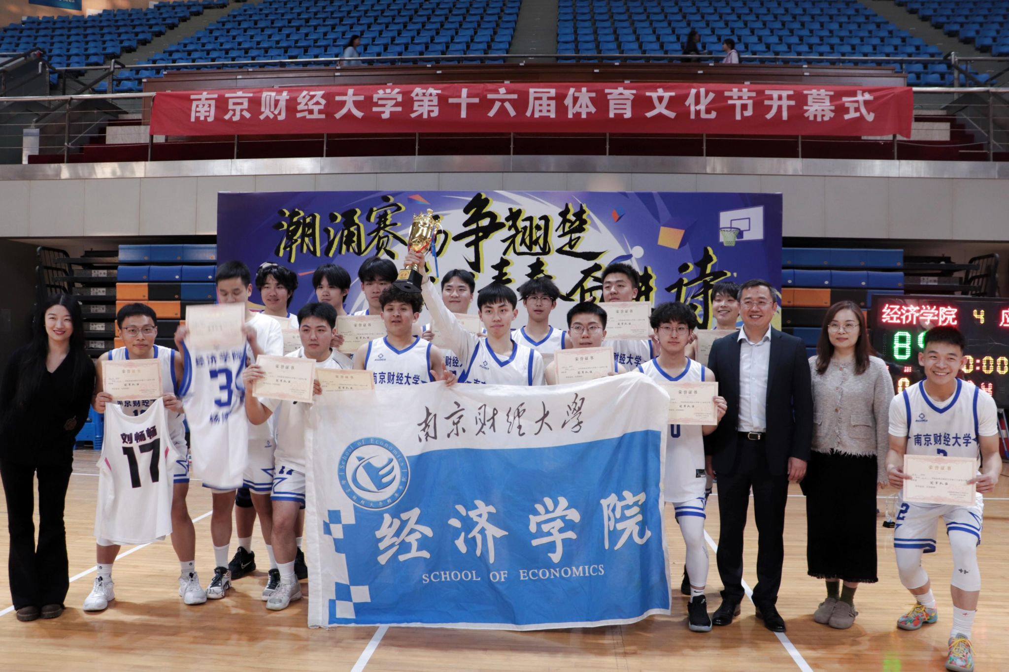 随着裁判哨声划破长空,双方队员迅速卡位、起跳争球,篮球高高弹起。球员们如猎豹般敏捷,运球、传球、投篮一气呵成,每一次跳跃都似疾风呼啸,每一次得分都引发观众的欢呼与喝彩,篮球划出完美弧线,引爆全场。最终,经济学院以89:80的比分摘得桂冠。