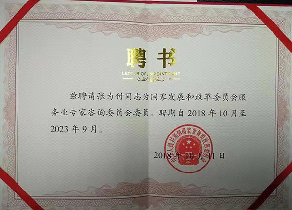 国家发展改革委服务业专家咨询委员会是国家制定实施服务业发展战略、政策的咨询机构,参与国家服务业发展的调研、政策咨询等工作。国家发展改革委服务业专家咨询委员是经过各省市发展和改革委员会推荐,国家发展和改革委员会评审聘请的兼职委员,任期为5年(2018年10月—2023年9月),不定期参加咨询活动,不领取报酬。