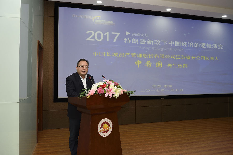 中国长城资产管理股份有限公司江苏省分公司负责人申希国致辞。他说,在特朗普新政下,经济是落脚点,我们要时刻关注国际、经济、金融等各个方面的变化,做好积极应对的准备。他还就特朗普新政的特点,以及对美国、中国的经济影响等作了介绍。