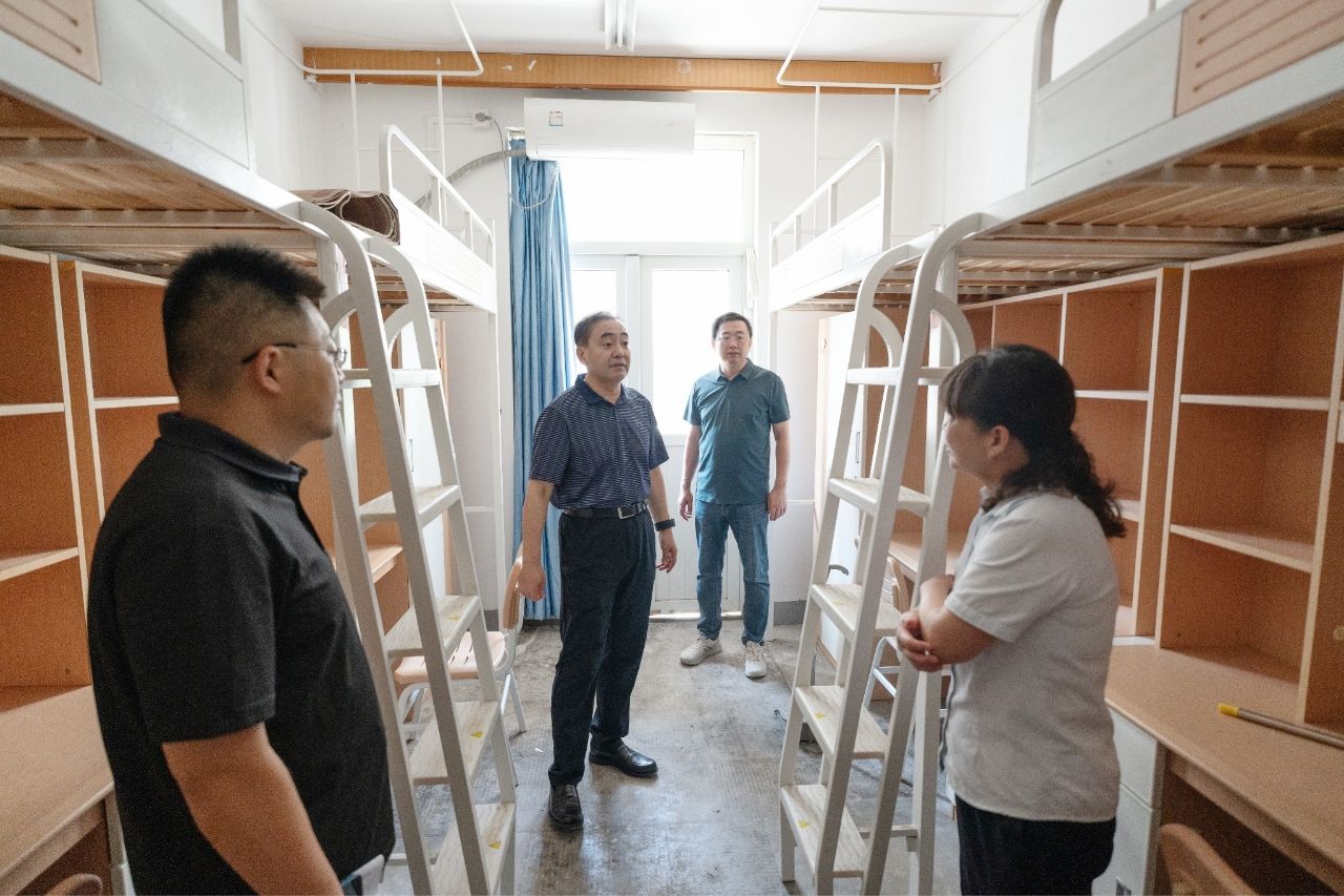 在西苑3号站宿舍改造工程现场和图书馆玻璃幕墙改造工程现场,程永波校长认真听取工作汇报,仔细察看施工进展,重点了解水电保障、生活设施改造及应急照明系统运行等情况。他强调,后勤基建工作是学校事业发展的重要基础保障,必须牢固树立“以师生为中心”的服务理念。他指出,校园改造工程必须将可靠性和安全性置于首位,严把工程质量与安全关,切实提升师生的获得感、幸福感和安全感。要时刻绷紧安全生产这根弦,严格执行施工规范,科学调度、精细管理,坚决守住安全底线。同时,应同步规划后续管理维护工作,在确保工程高质量完成并长期发挥效益的同时,注重维护公共区域环境整洁,周密做好验收、保洁等环节,真正将以生为本的理念贯穿改造工程始终。