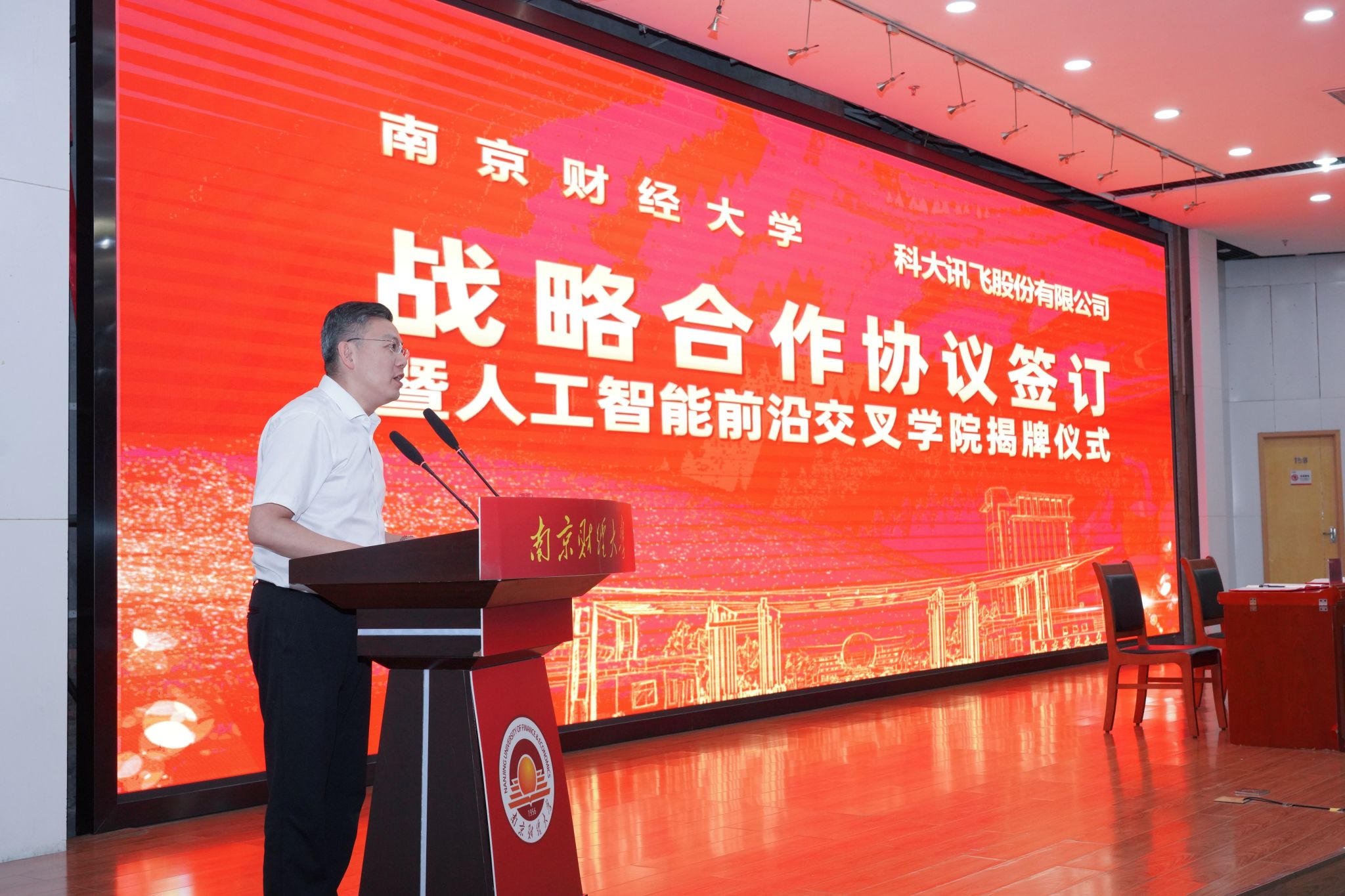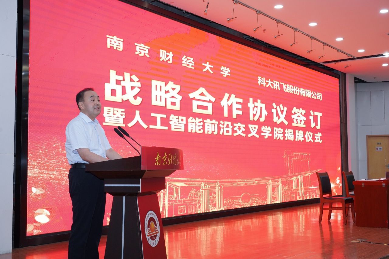 程永波校长代表学校,向出席签约仪式的领导和嘉宾表示热烈欢迎与衷心感谢,并介绍了学校近年来顺应人工智能发展、推动学科交叉融合的系列举措。他指出,在国务院印发《关于深入实施“人工智能+”行动的意见》,推动人工智能更好服务中国式现代化建设之际,积极响应国家战略与未来发展需求,与科大讯飞开展全面战略合作,是学校构筑发展新优势、提升核心竞争力的战略选择,更承载着学校服务江苏“走在前、做示范”、助力江苏扛起“经济大省挑大梁”责任的重要使命。希望双方以人工智能前沿交叉学院为核心载体,共育高素质复合型人才,共建高水平交叉学科平台,共促师资队伍能力提升,共推财经、管理、粮食安全等关键领域科技创新,合力打造“产、学、研、转、创、用”六位一体的产教融合新标杆,为教育数字化转型升级与区域经济社会高质量发展注入新动能。