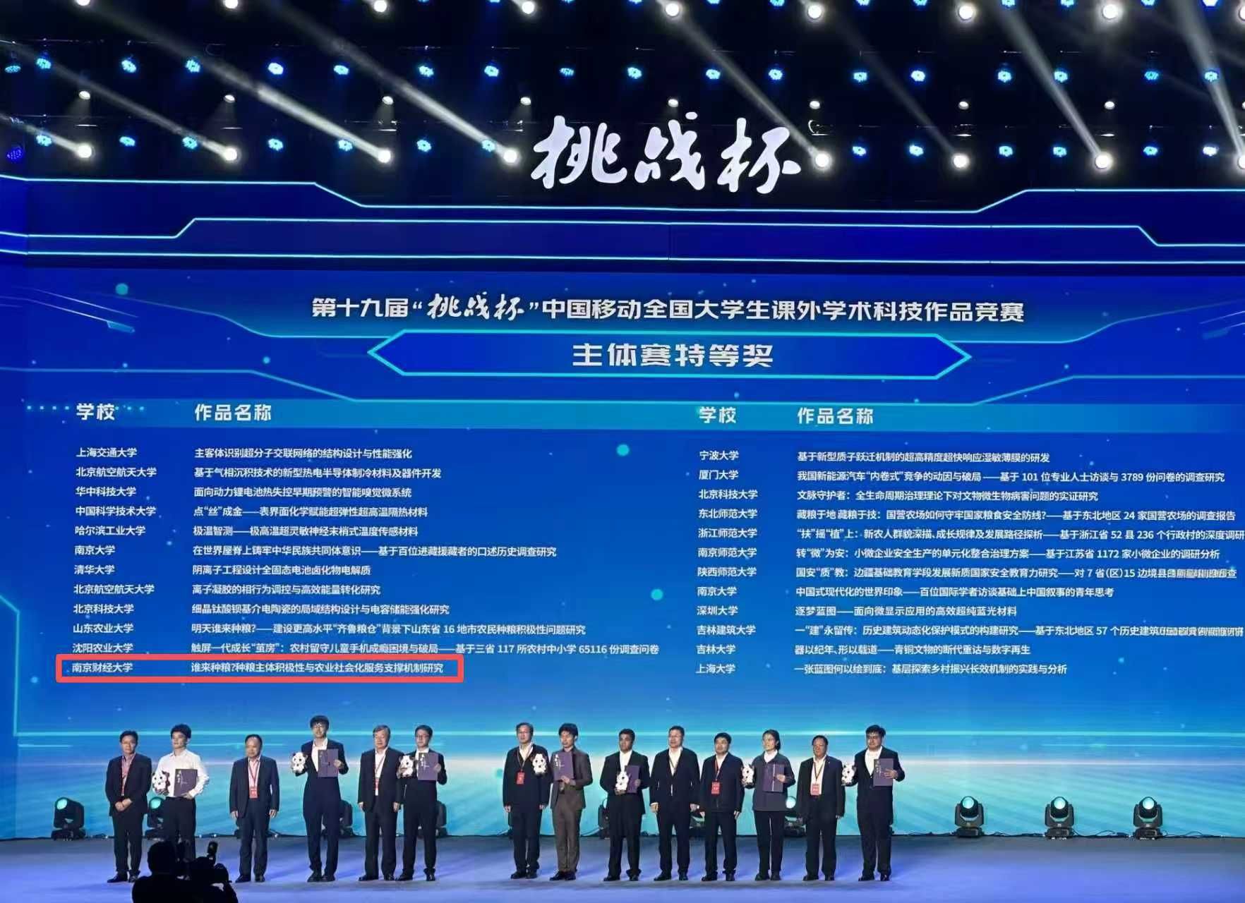 10月31日至11月3日,第十九届“挑战杯”全国大学生课外学术科技作品竞赛在南京大学举行。经网评初审、集中复审、现场答辩,金年会学子表现优异,脱颖而出,在主体赛中获特等奖1项、三等奖1项;在“揭榜挂帅”擂台赛中获二等奖1项、三等奖1项;在“人工智能+”专项赛中获二等奖1项。这是金年会首次于主体赛“科技发明制作”类别获国家级奖项,同时也是全国唯一连续两届在主体赛中斩获特等奖的财经院校。