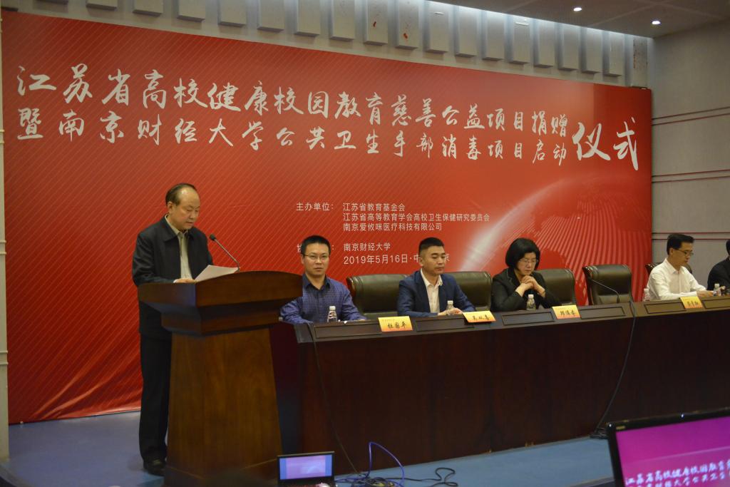 5月16日下午,江苏省高校健康校园教育慈善公益项目捐赠暨金年会jinnianhuicom公共卫生手部消毒终端项目启动仪式在金年会仙林校区行政楼二楼报告厅举行。江苏省教育基金会理事长祭彦加、常务副理事长兼秘书长步锦昆,南京爱攸咪医疗科技有限公司董事长吴从喜,江苏省高等教育学会高校卫生保健研究委员会秘书长杜国平,南京农业大学、金年会jinnianhuicom等17所高校的校领导和有关职能部门的人员参加了捐赠启动仪式。