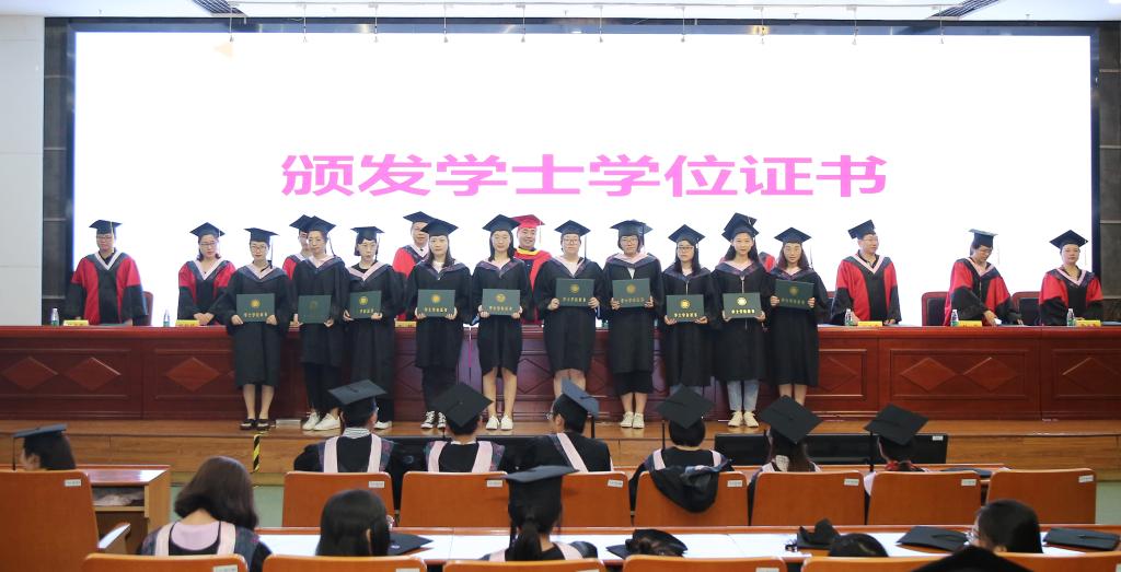 在各学院分管教学副院长宣读《关于授予2019届毕业生学士学位的决定》后,毕业生们身穿学士服走上前台,校领导、学院领导、教授为他们一一拨过学位帽上的流苏,授予学士学位证书。