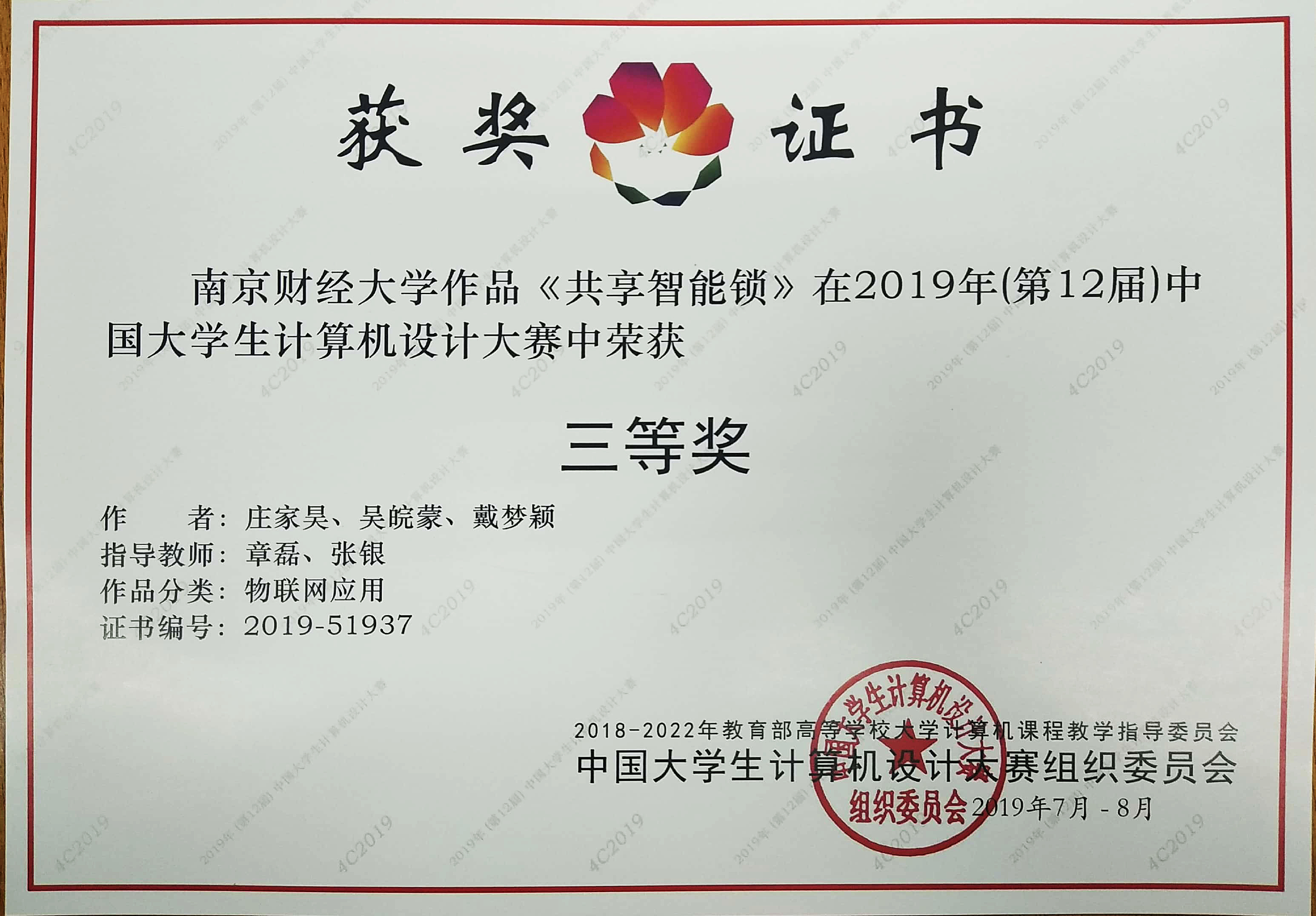 暑假期间,2019年(第12届)中国大学生计算机设计大赛全国总决赛落下帷幕。经过紧张激烈的现场答辩和专家评审,由金年会信息工程学院组建团队开发完成的作品《共享智能锁》荣获“物联网应用”类三等奖(团队成员:庄家昊、吴皖蒙、戴梦颖,指导老师:章磊、张银),作品《基于电商虚假评论的大数据方案设计》荣获“大数据”类三等奖(团队成员:王欣哲、李梦倩、邱荣燚,指导老师:李树青)。