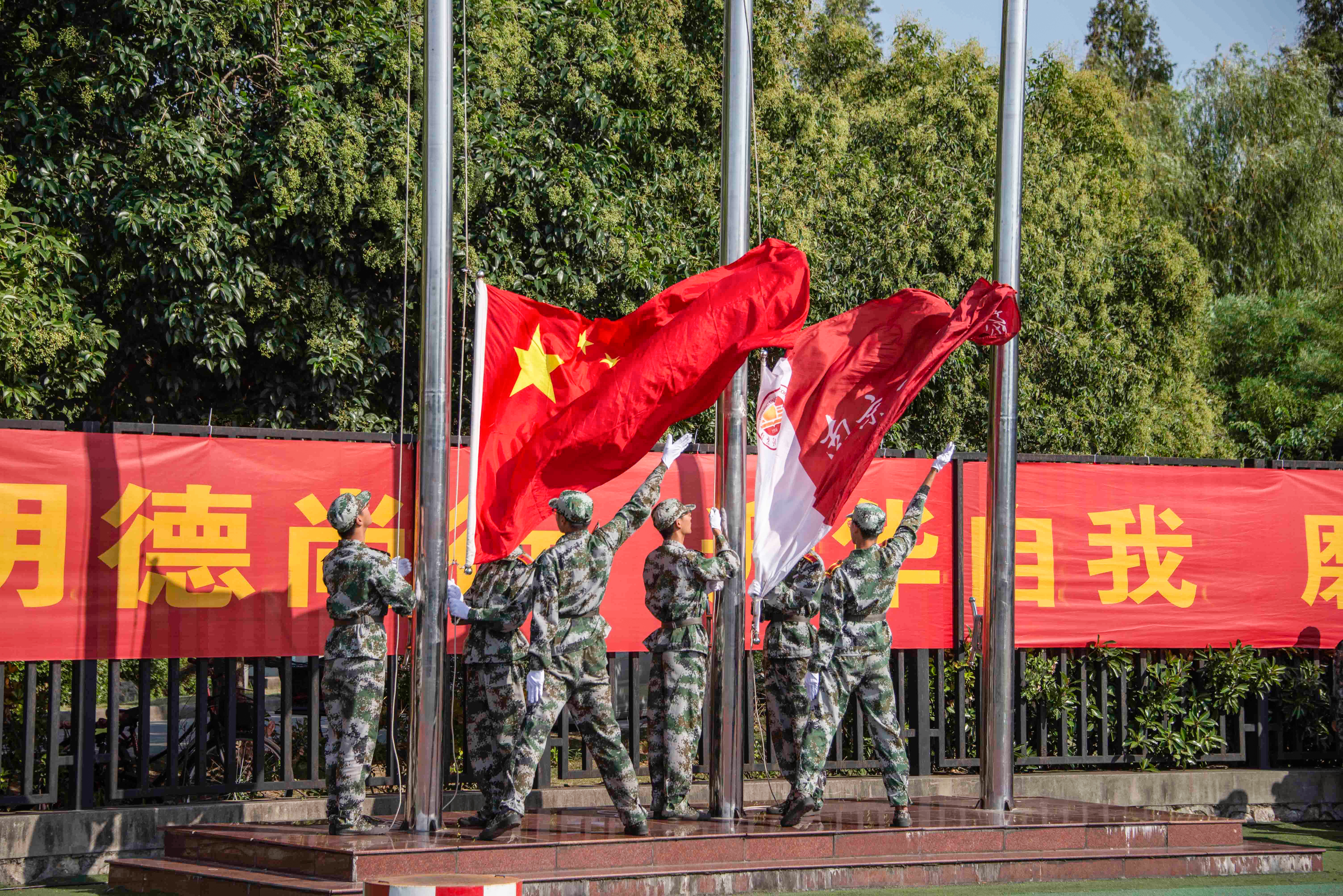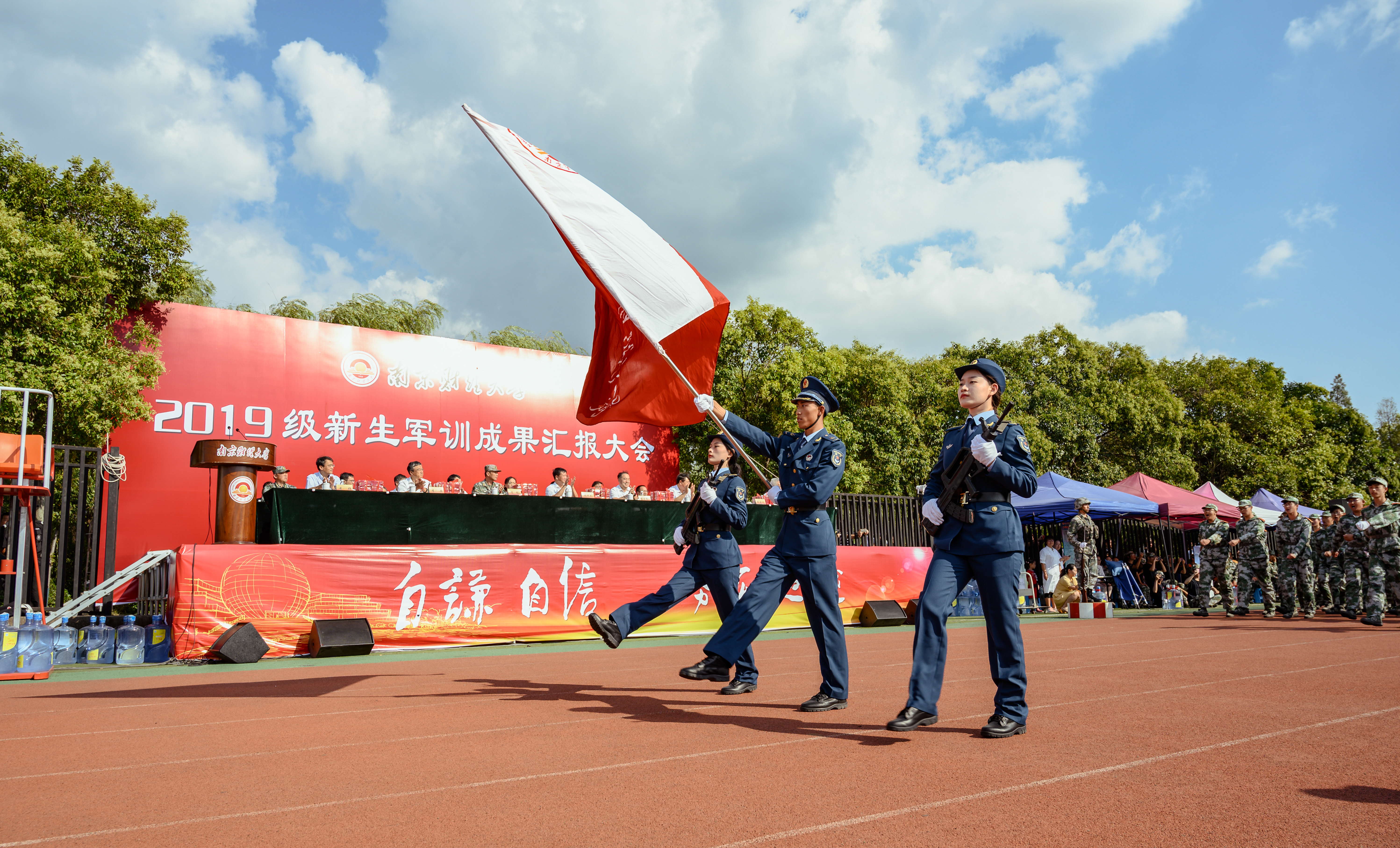 随着三名护旗手护卫校旗庄严走入会场,2019级新生军训成果汇报大会正式开始。