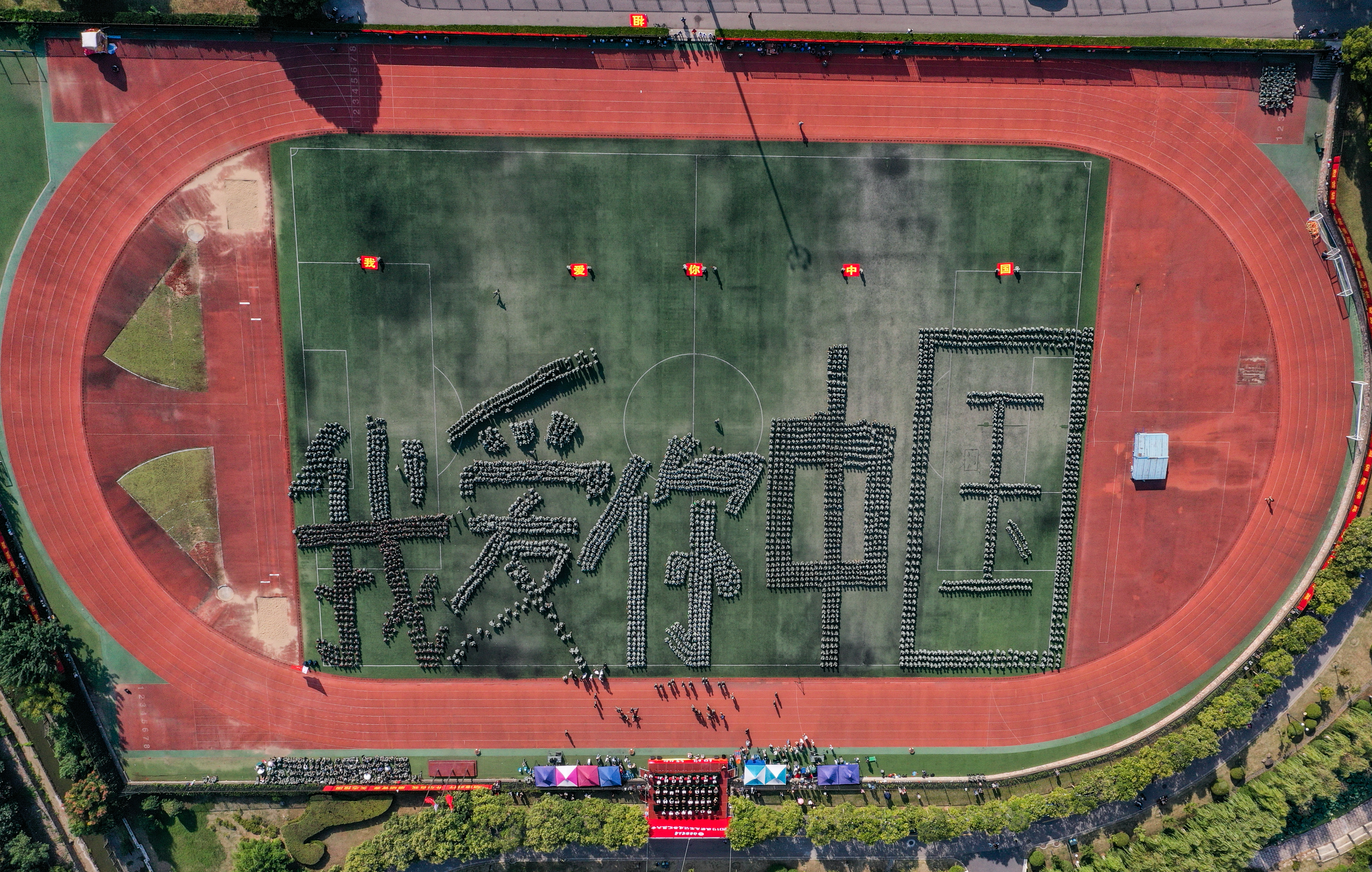 在慷慨嘹亮的阅兵进行曲中,各学院方阵昂首挺胸,整齐划一依次走过主席台,激昂豪迈的口号声迸发出蓬勃的朝气,紧凑整齐的队列凸显了严明的纪律。雄壮的军乐振奋人心,旗语、捕俘刀、捕俘拳、棍术表演精彩纷呈。旗语方阵彩旗猎猎,通过手势变换表白祖国、表白金年会。男生的少林棍豪迈有力、势如破竹,女生的捕俘刀银光闪烁,展现巾帼英姿。随后,由全体新生组成的五个大字“我爱你中国”赫然出现在绿茵之上,他们用这幅气势恢宏的画卷为新中国成立70周年献礼。