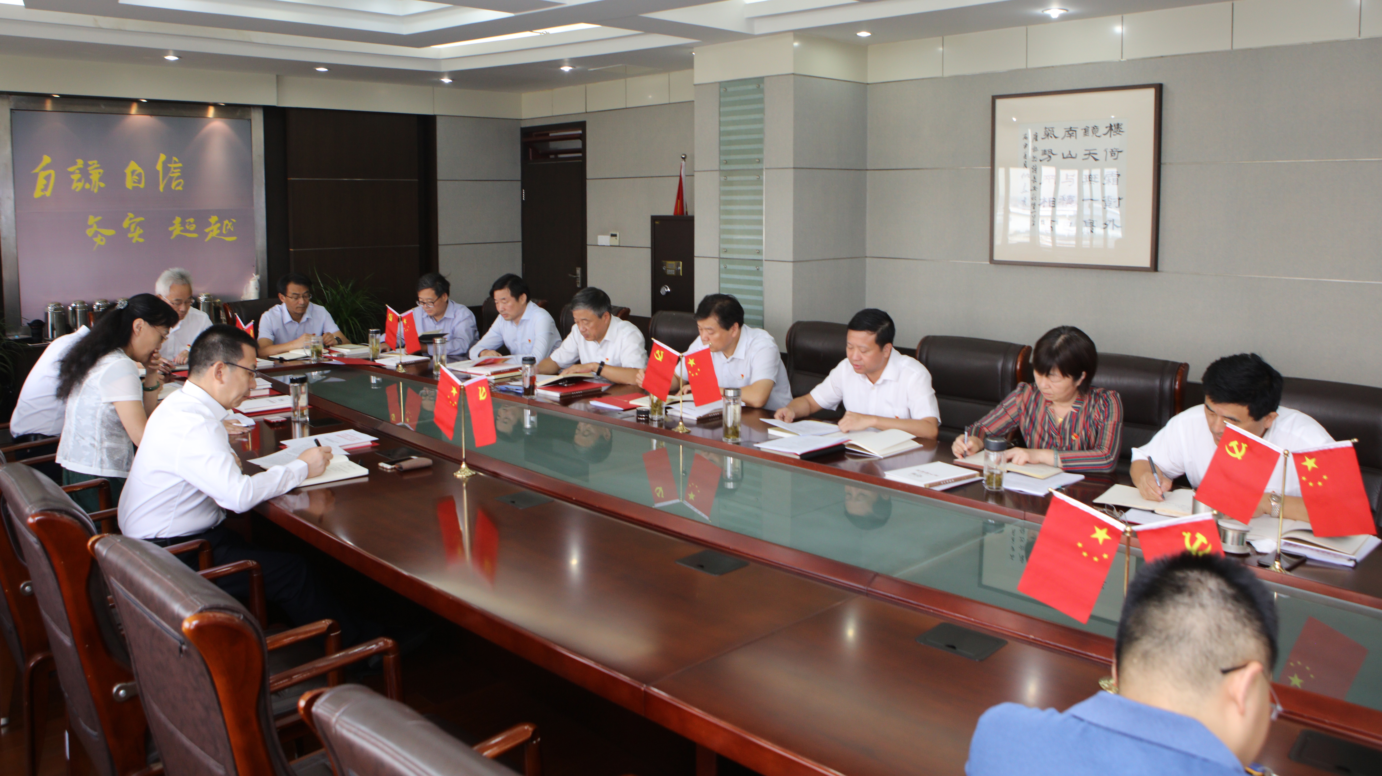 集中学习研讨前,全体党委常委在党旗下诵读了《共产党宣言》的部分章节,观看了《十九大党章知识精粹》系列微视频。