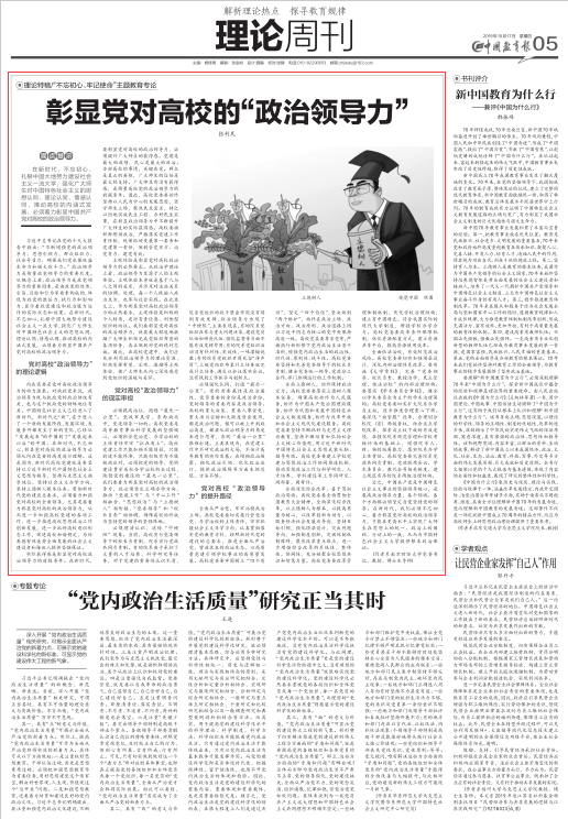 10月17日,《中国教育报》理论周刊版刊发了校党委书记张利民的署名文章《彰显党对高校的“政治领导力”》,全文3200余字。文章指出,在新时代,不忘初心,扎根中国大地努力建设社会主义一流大学,强化广大师生对中国特色社会主义的思想认同、理论认同、情感认同,推动高校的内涵式发展,必须着力彰显中国共产党对高校的政治领导力。文章从党对高校“政治领导力”的理论逻辑、党对高校“政治领导力”的现实审视、党对高校“政治领导力”的提升路径等三个方面进行了深刻阐释。文章强调,中国共产党是中国特色社会主义事业的坚强领导核心,是最高政治领导力量,各个领域、各个方面都必须坚定自觉坚持党的领导。在新时代,我们必须不忘初心,着力彰显党对高校的政治领导力,才能在更高水平上实现广大师生在思想上的统一、政治上的团结、行动上的一致,从而为中国特色社会主义大学提供根本政治保证。