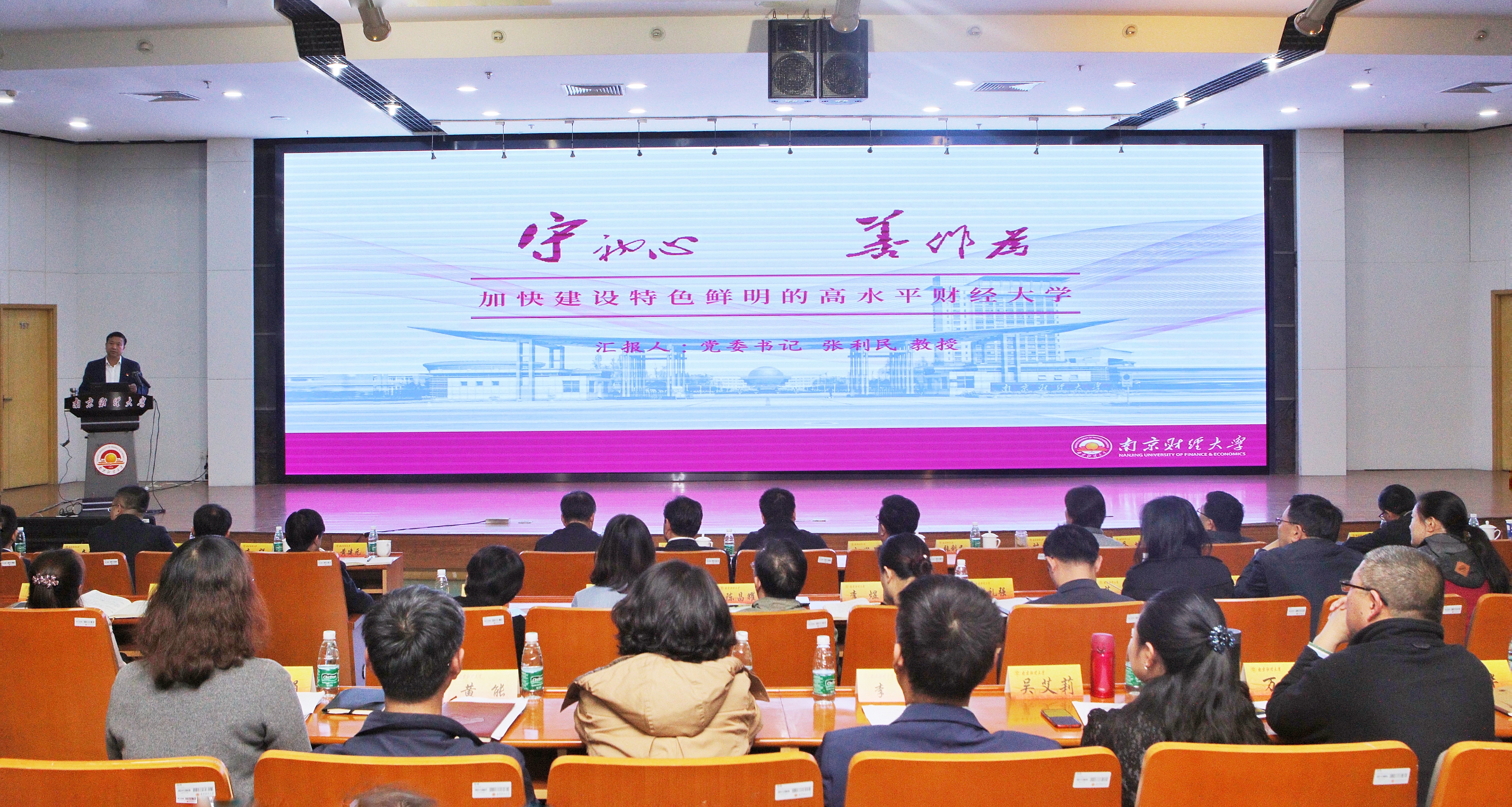10月29日下午,根据“不忘初心、牢记使命”主题教育工作安排,校党委书记张利民在仙林校区图书馆报告厅讲授“守初心 善作为 加快建设特色鲜明的高水平财经大学”专题党课。省委主题教育第七巡回指导组组长江里程、指导组成员谭子祥到场指导。全体党员校领导,党委委员、纪委委员,中层党员领导干部,基层党支部书记,部分师生党员代表参加党课学习。