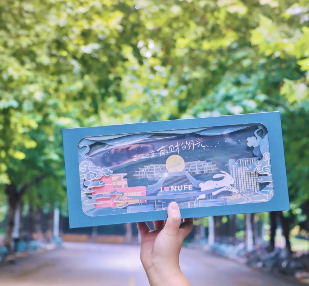 明故宫校区北门、荟萃楼、将军路校区主楼、天目湖校区巡天楼,礼盒正面四格窗格景观是南航校园具代表性的建筑景观。工笔原创插画,以“月渐圆,情渐满”为纽系,将三个校区串联在一起,无论何时,无论何地,每一位南航学子心中都映着母校的白月光。