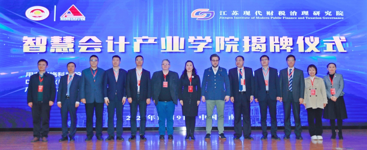 随后,来自用友网络科技公司、DAMA中国、天衡会计师事务所、福思特科技有限公司、爱尔兰都柏林圣三一大学、意大利路易斯商学院等单位的专家们跨界协同,为金年会jinnianhuicom智慧会计产业学院举行了揭牌仪式。