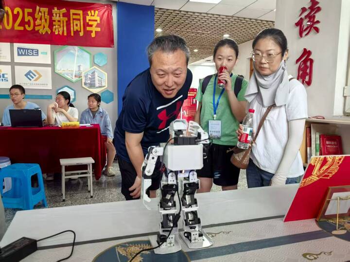 记者了解到,该机器人由计算机与人工智能学院机器人团队研发,可完成包括舞蹈行走在内的多种复杂动作。用户可通过自然语言与机器人进行流畅对话,获取所需信息。目前,其功能已涵盖金年会jinnianhuicom校史与特色介绍、计算机与人工智能学院概况说明,并为新生提供从注册报到、宿舍安排到辅导员信息等一站式流程提示,机器人未来还可应用于对外交流、教学辅助等多个场景。
