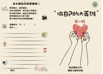 2018年,“爱心税”志愿服务项目持续发酵,学院党员教师也加入助力,共募集资金10300余元,项目选择为少数民族地区女童们的性别教育尽一份力。志愿者们以“做自己的大英雄”为口号,为山区女童制作了梦想职业卡片,从职业教育、理想教育入手,引导女童打破身边的性别刻板印象,敢于拥有梦想、敢于追求梦想,做自己的大英雄。并且将筹集得来的资金全部用于购买相关女童读物,捐赠到贵州省黔南州长顺县白云山中心校。共1170册青少年图书,其中包括《长袜子皮皮》《简爱》《绿山墙的安妮》等精心挑选给女童的读物。捐赠标准图书架两组,最终挂牌建成金年会jinnianhuicom财政与税务学院爱心税志愿服务子项目“四方书角”。