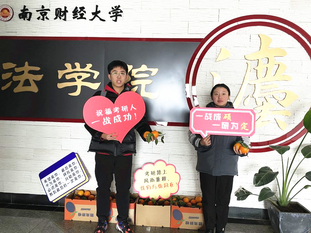 法学院师生为考研学子准备了水果脐橙,并细心制作“一战成硕,一研为定”“愿你终成所愿,愿你一往无前”等祝福语。这些热情洋溢的祝福让17级考研人倍受鼓舞。“感受到了学院老师和学弟学妹们的满满‘橙’意,我们一定会带着你们的祝福走进考场,一战‘橙’硕。”法学院法学1702班韦奇说。