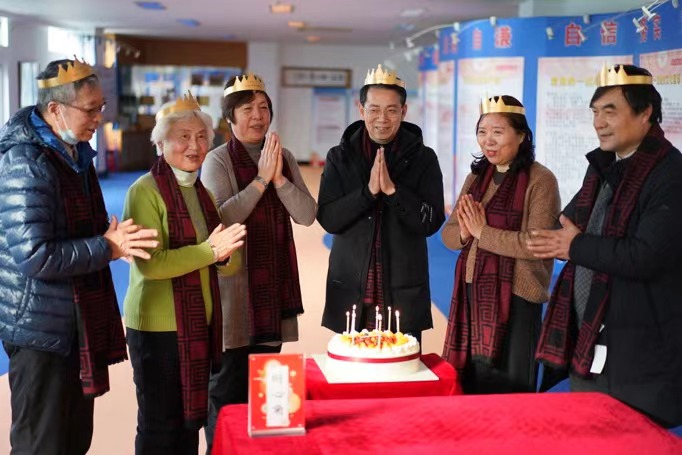 伴随着欢快的生日歌,老教师们围上写满“福”字的红围巾,一起许愿祈福。切下象征美好祝福的生日蛋糕,祝愿老师们活出健康、活出精彩。