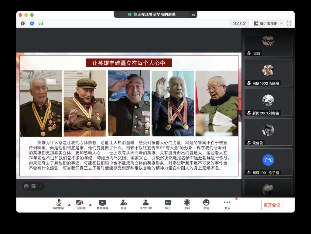 最后,同学们观看了此次抗美援朝访谈活动的视频,视频主创、新闻1801班秦曼科同学谈到自己的创作心得时表示,“崇尚英雄才会产生英雄,我们应让英雄丰碑矗立在每个人心中。”