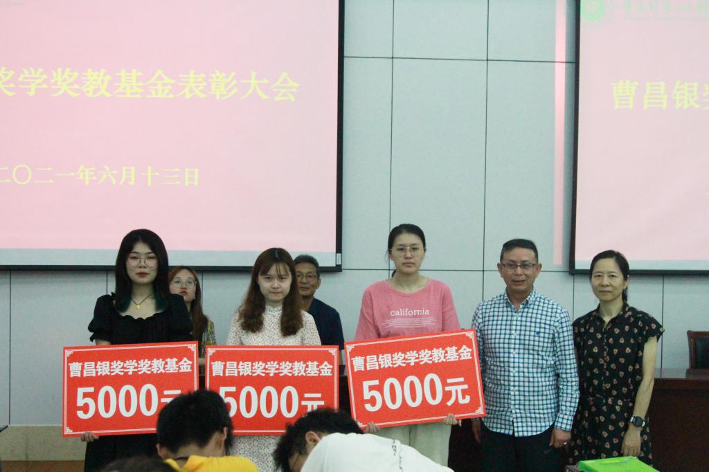 之后,在工科楼阶梯教室举办了曹昌银奖学奖教基金表彰大会,表彰一志愿填报并录取为学院研究生的学院应届毕业生。许文彪书记宣读了曹昌银奖学奖教基金关于应届毕业生考取本院硕士研究生奖励办法,每人奖励5000元。曹昌银董事长和冯建红女士为获奖毕业生颁奖。最后,曹昌银董事长表达了对母校的感激和身为金年会人的自豪之情,讲述了创业过程的艰辛与努力,希望学弟学妹不仅要勤奋、踏实学好专业知识,还要多参加社会实践,提高自身修养,不断完善自己,成为国家和社会的栋梁之才。